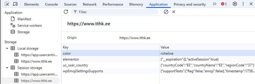 6. Et näha, mis on Session Storage’isse salvestatud, mine Application>Session Storage>vastav domeen