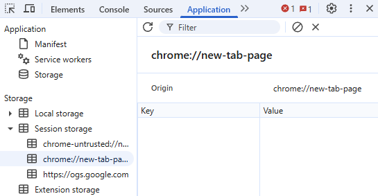 Nüüd ava veel üks vahekaart ning mine samale lehele (chrome://newtab). Ava uuesti Application>Session Storage ning näed, et see on tühi.