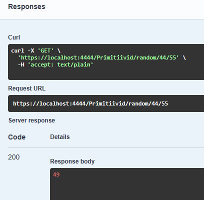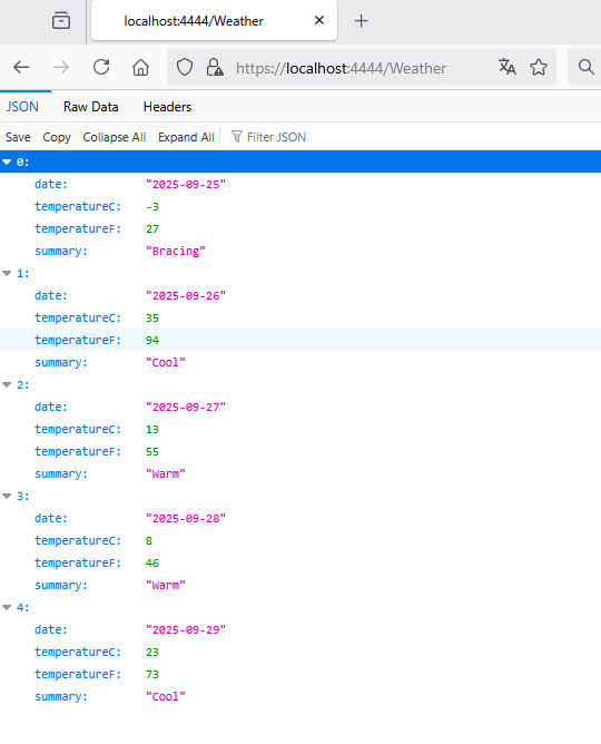 Käivitame projekt ja kontrollime muudatud aadress (GET endpoint): https://localhost:4444/Weather