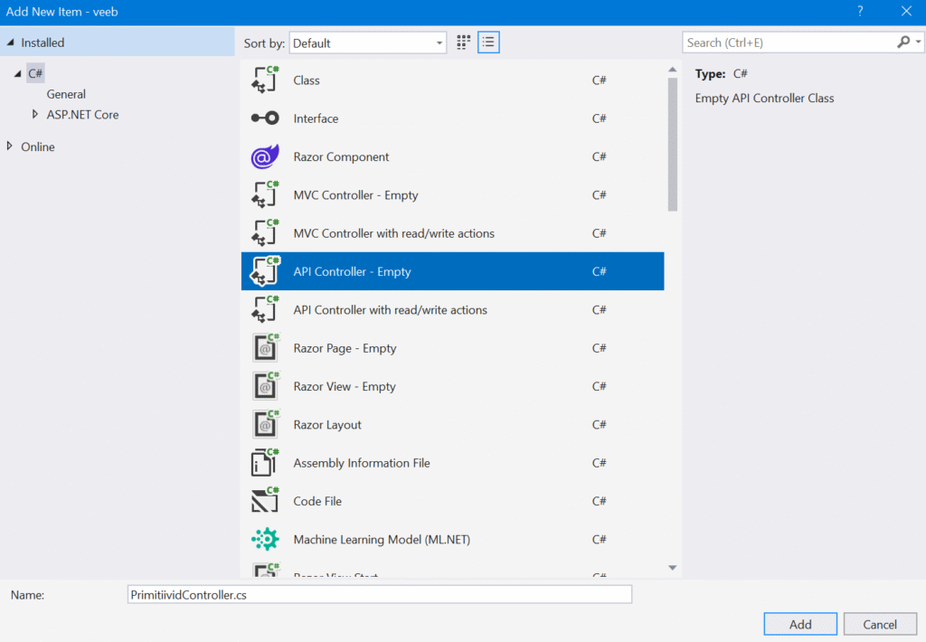 Selleks loome uue faili: PrimitiividController, millega saame teha päringuid primitiivsete tüüpidega.
