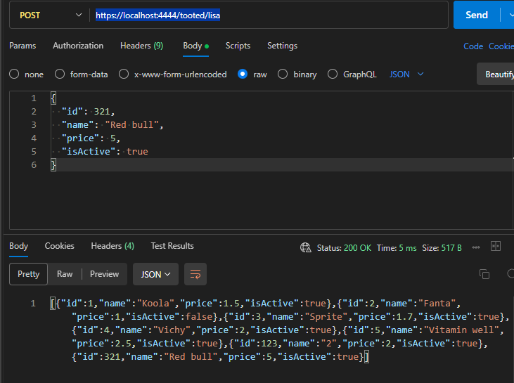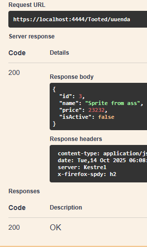 - Tee uus API otspunkt, mis käivitades muudab toote nime. Võta selleks kasutusele URL muutuja ning määra tootele.
